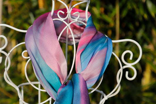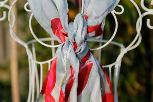 Collezioni di Pura Seta raso, che spazia dalla leggerezza dei 9 Momi dove creiami delle piccole sciarpe, al 12 Momi (tramatura più pregiata e pesante e più lucida) con tagli di sciarpe più grosse ed importanti.