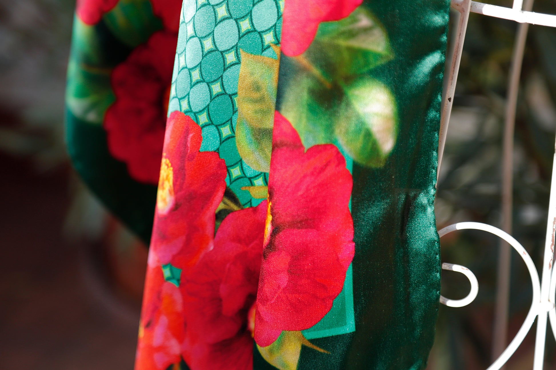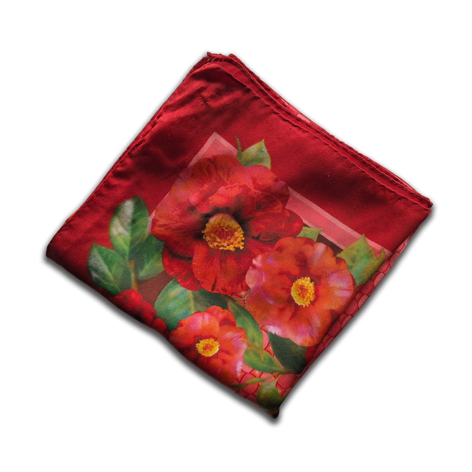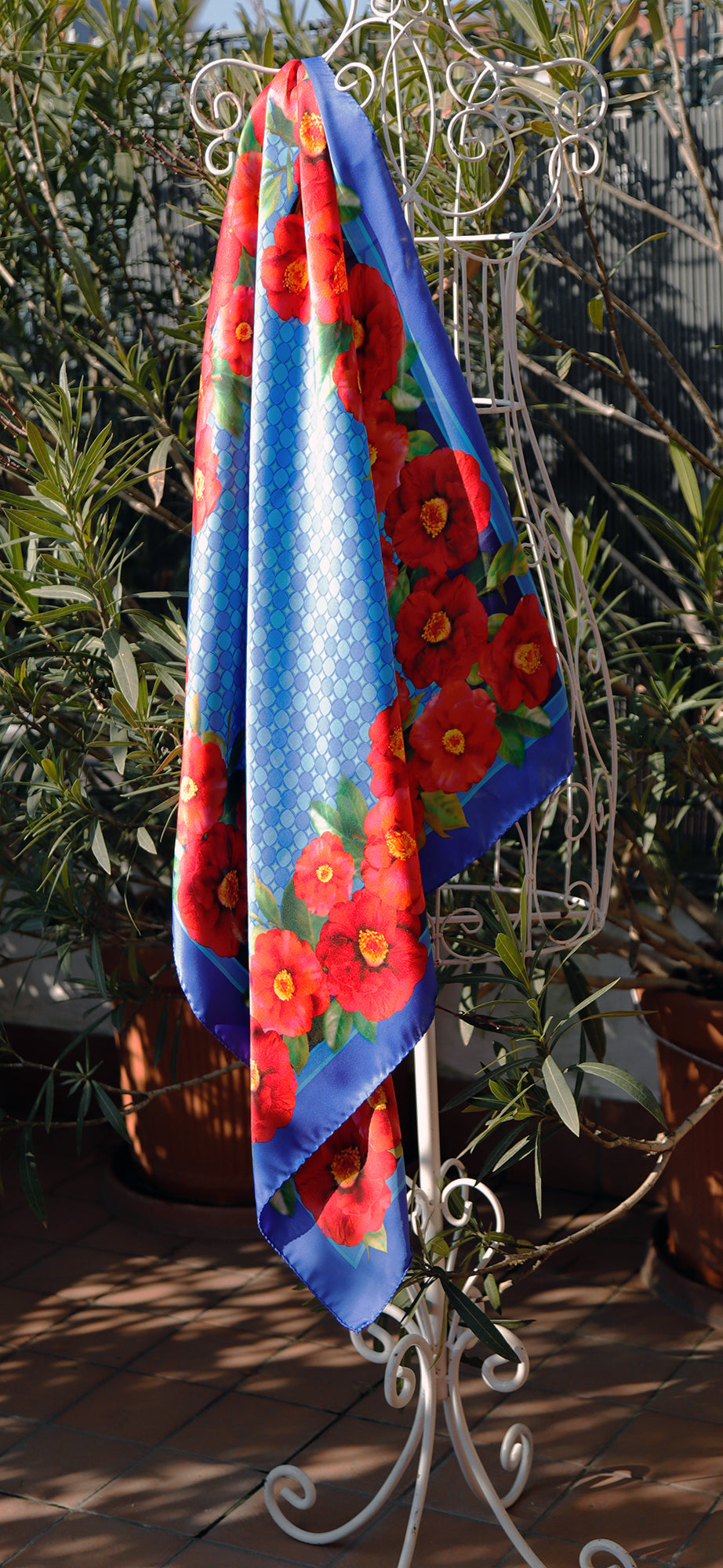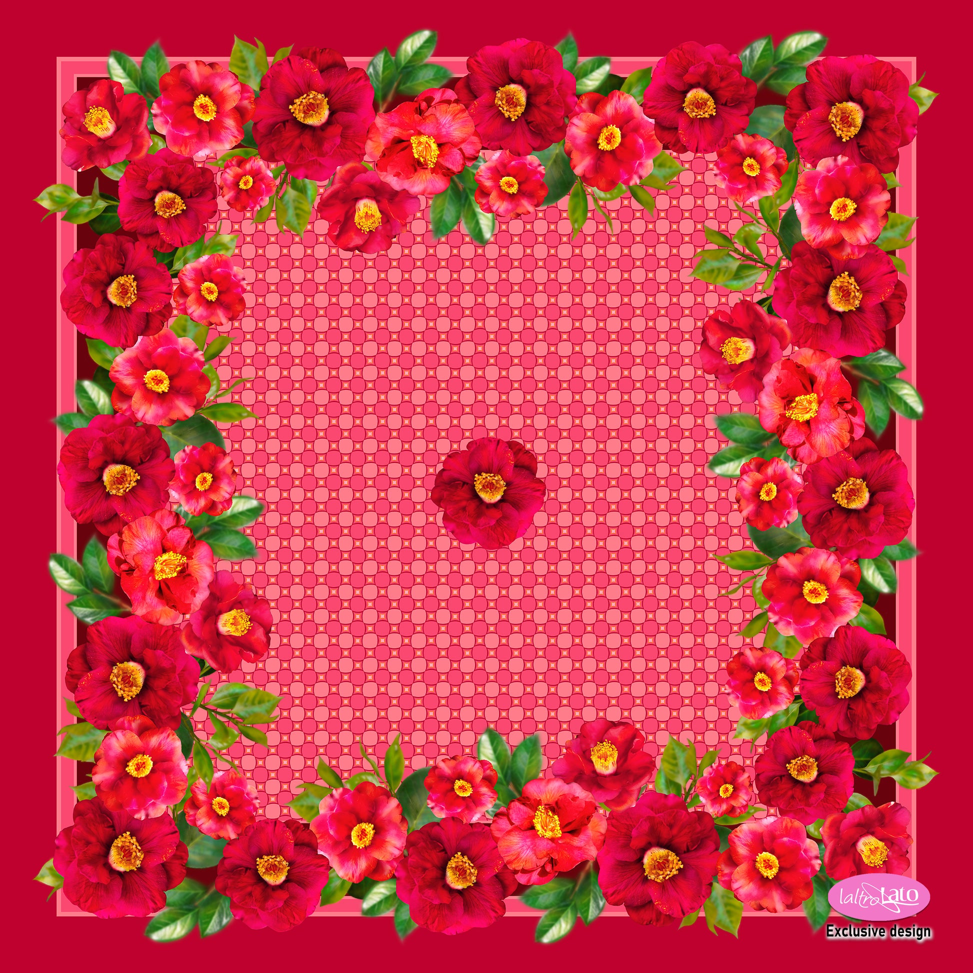 Bordato da colorate camelie rosse, sullo sfondo fantasia geometrica in tre varianti colore abbinate al bordo del foulard: rosso, verde e blu.
