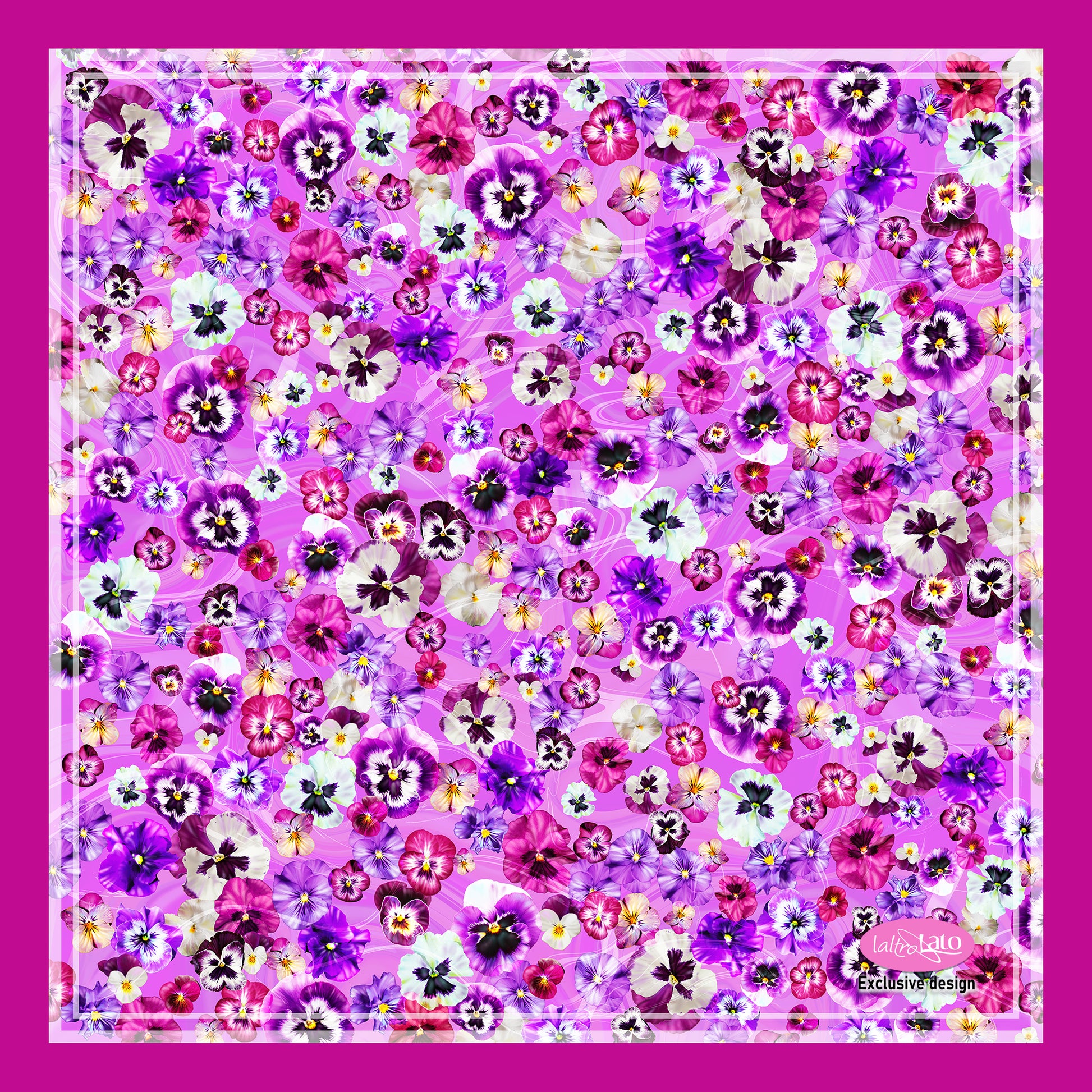 Bellissime violette molto definite nei toni del viola, lilla e bianco, disegnano tutto il foulard, bordato in tinta.