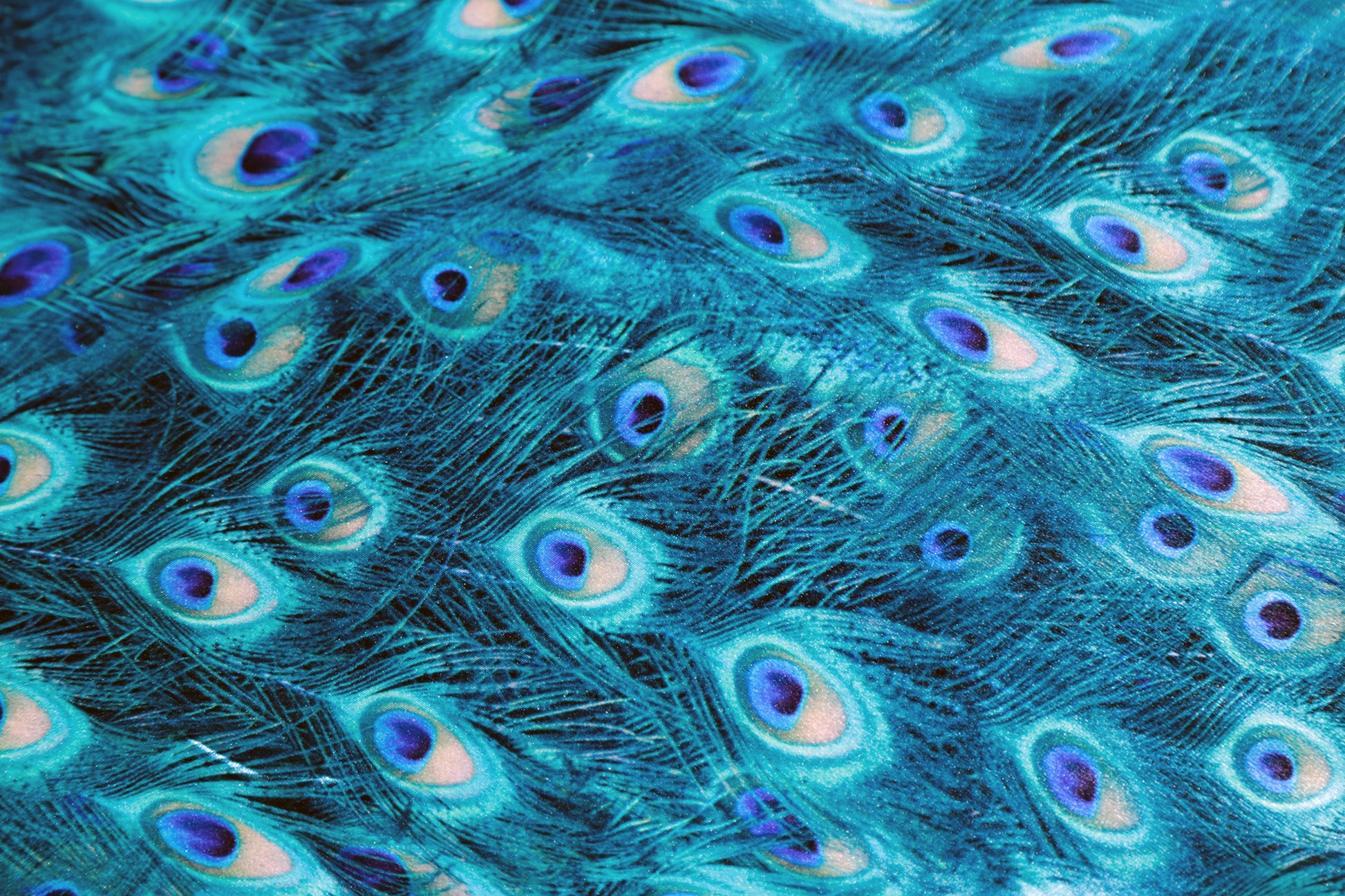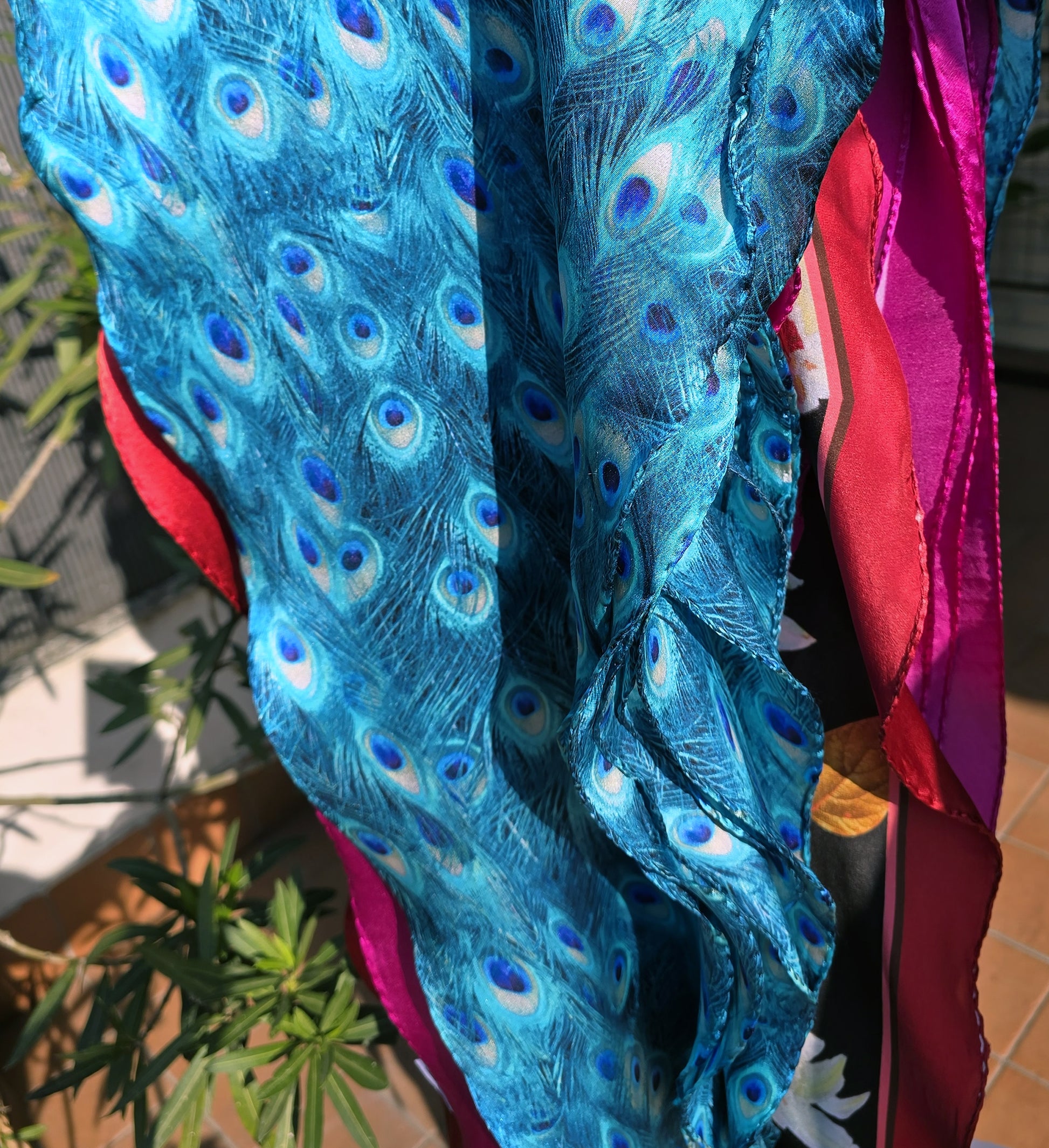 Piume di pavone disegnano il foulard nella variante blu petrolio, particolarmente luminosa sulla seta.