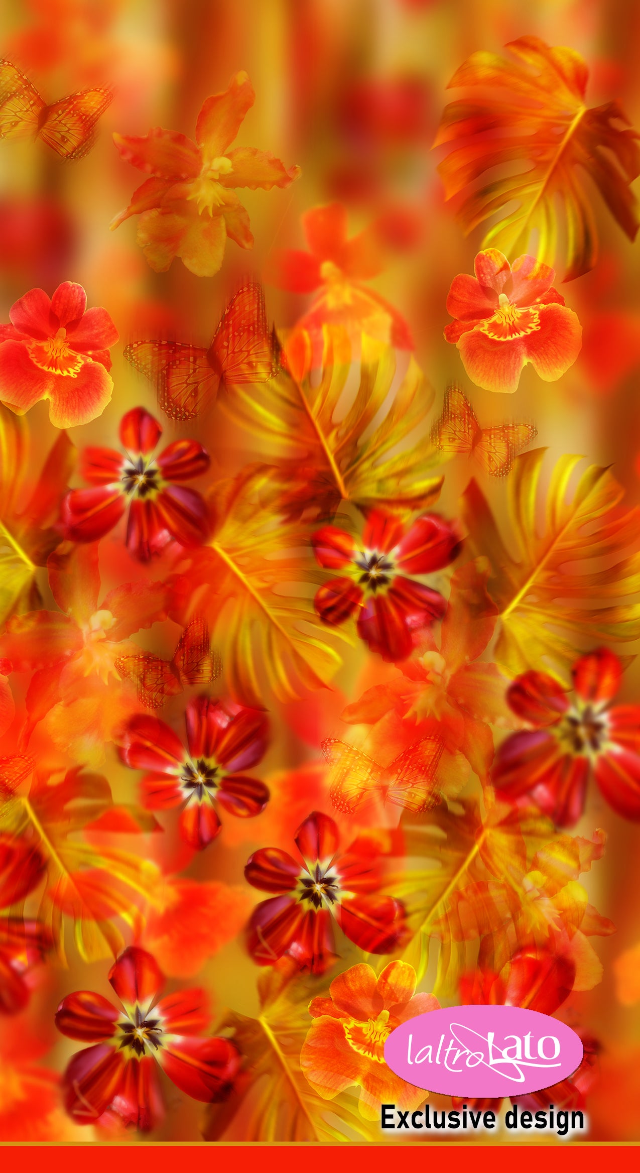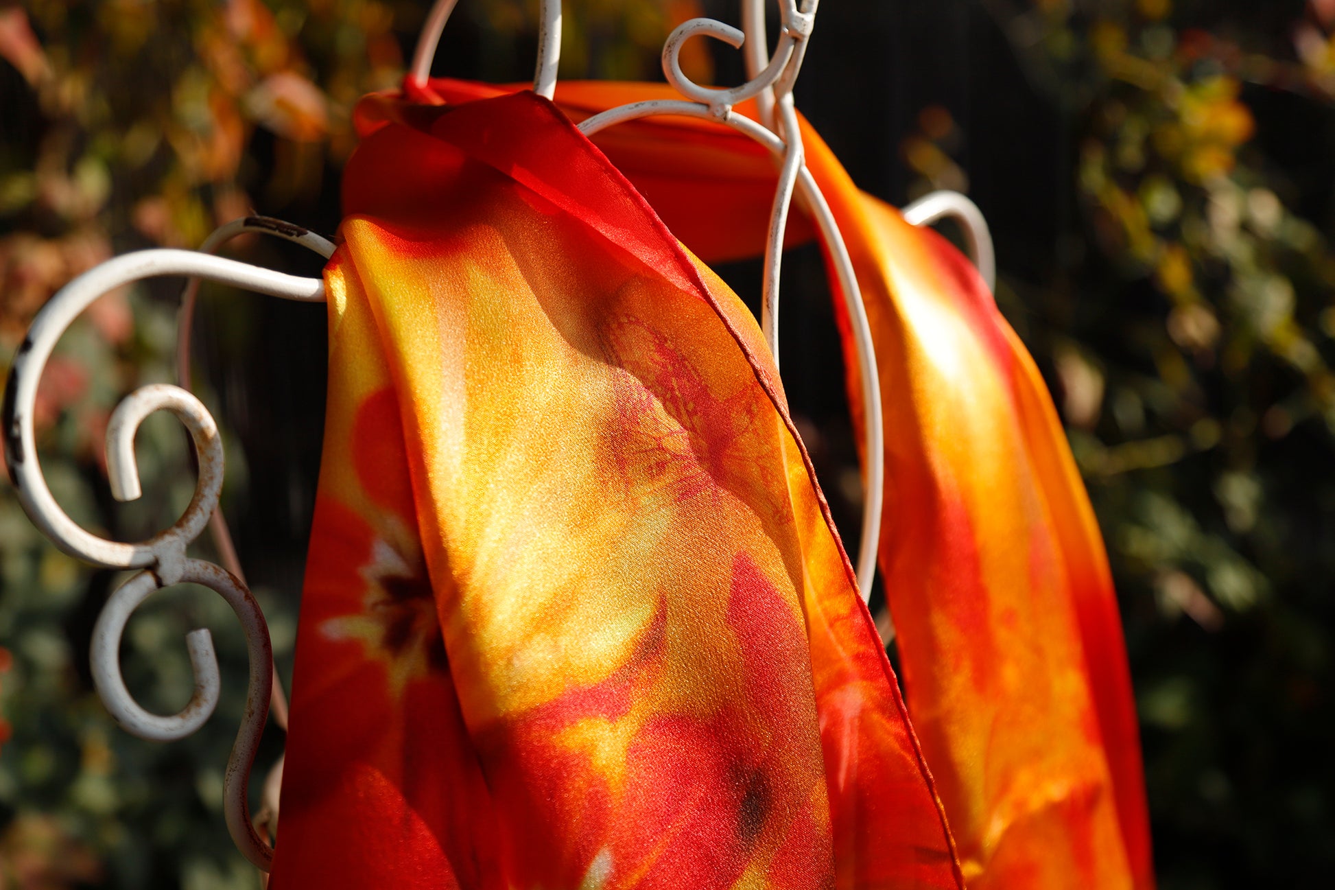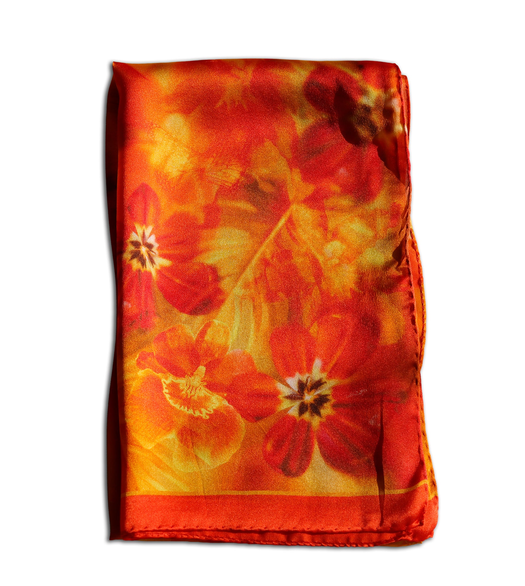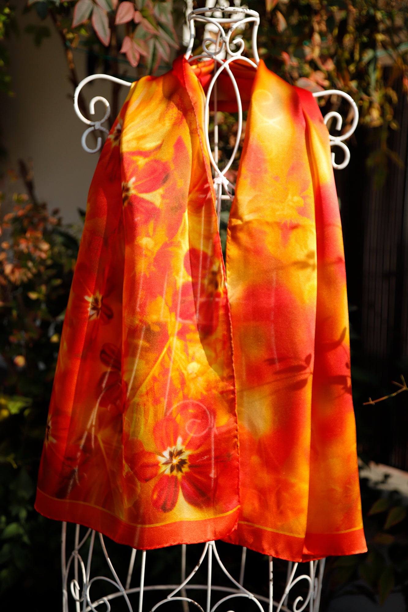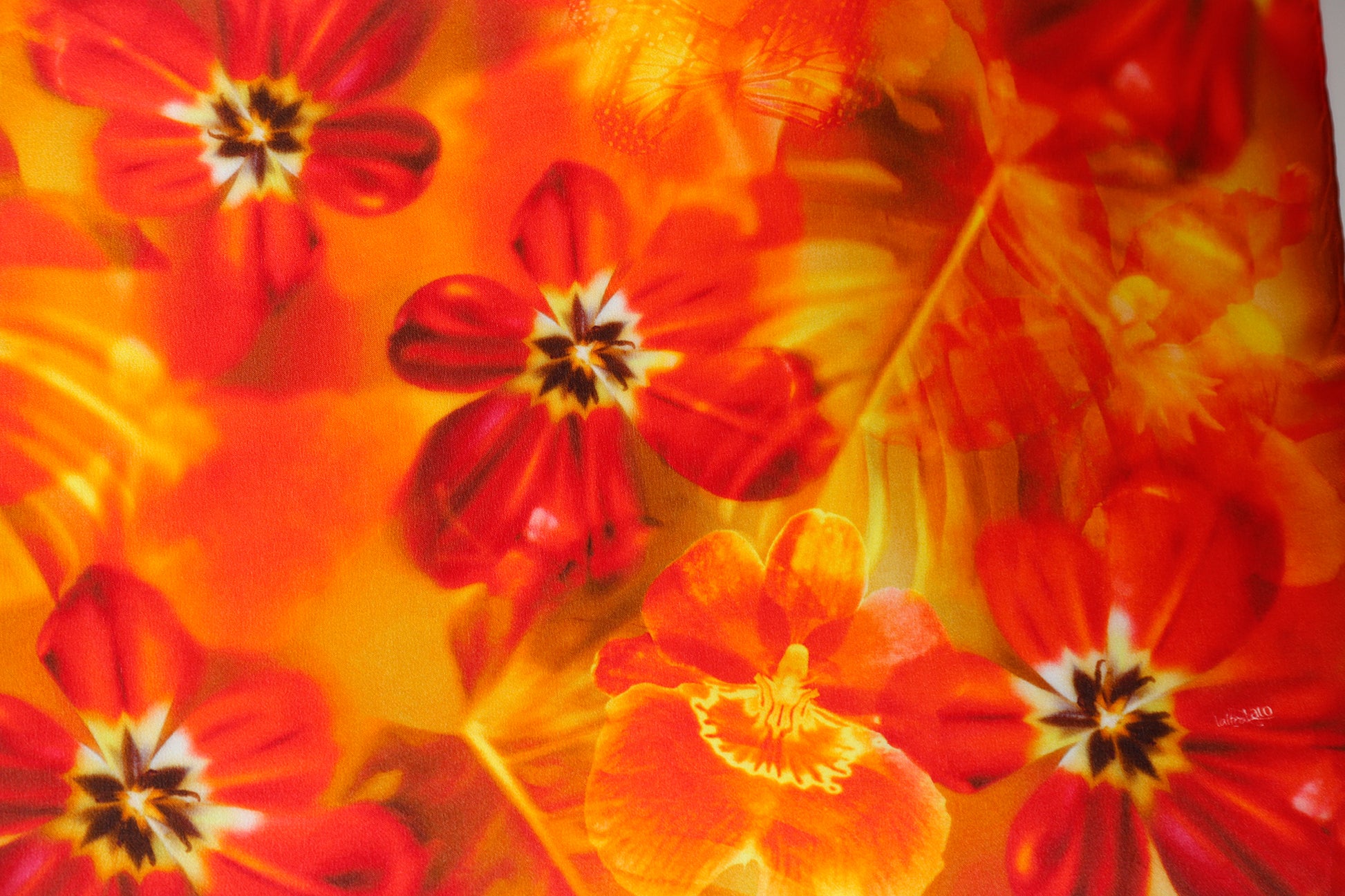 Delicate sfumature nei toni del rosso, arancione e giallo/giallo cora si fondono tra loro e tra colorati tulipani negli stessi toni colore che riempono un lato della sciarpa, con bordo rosso.