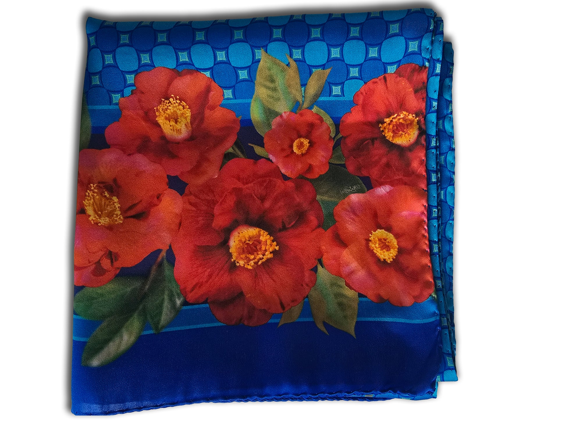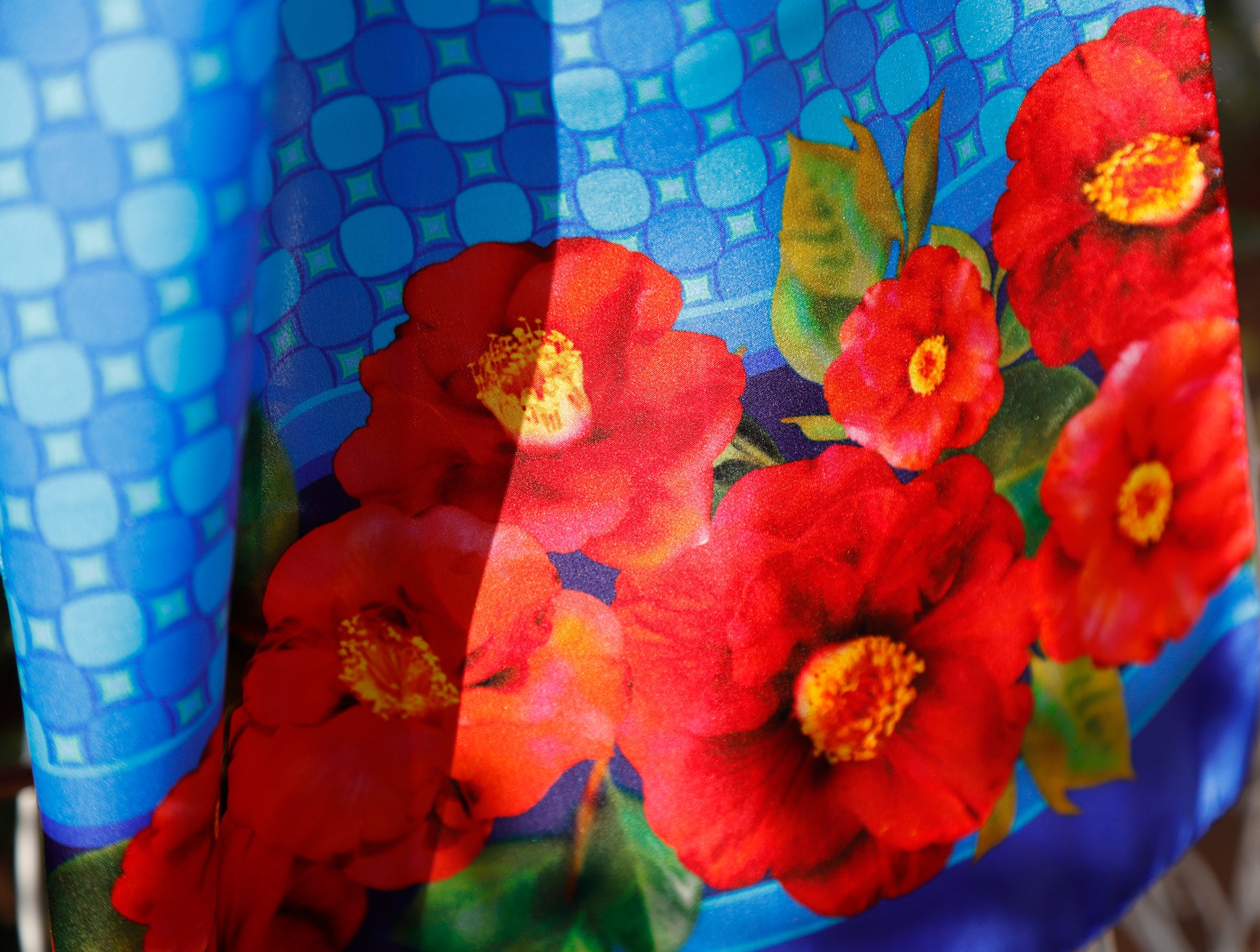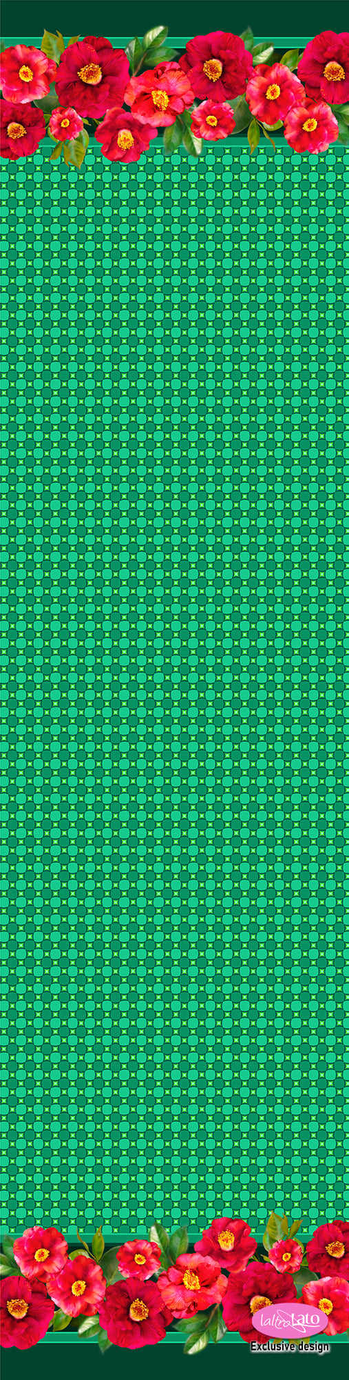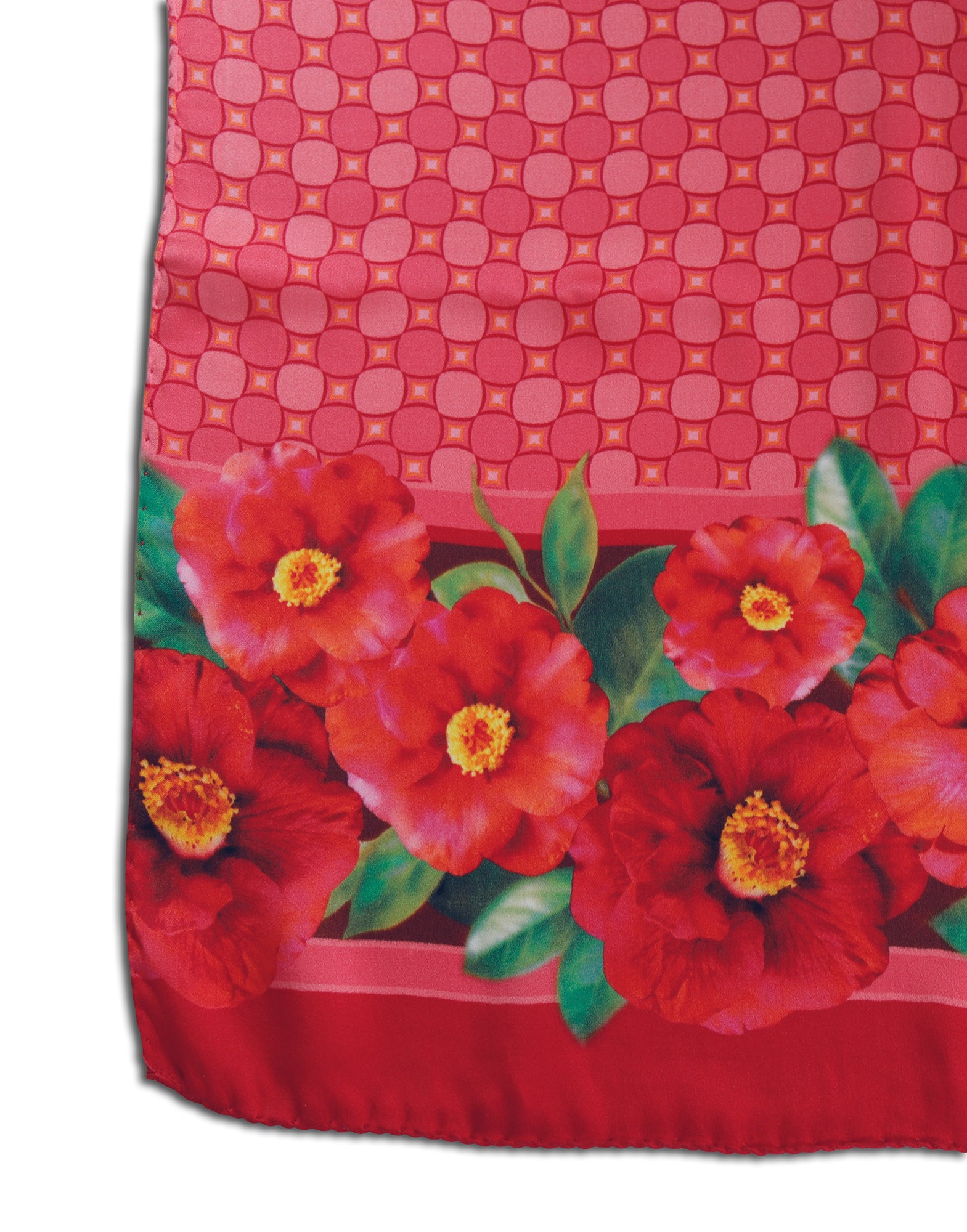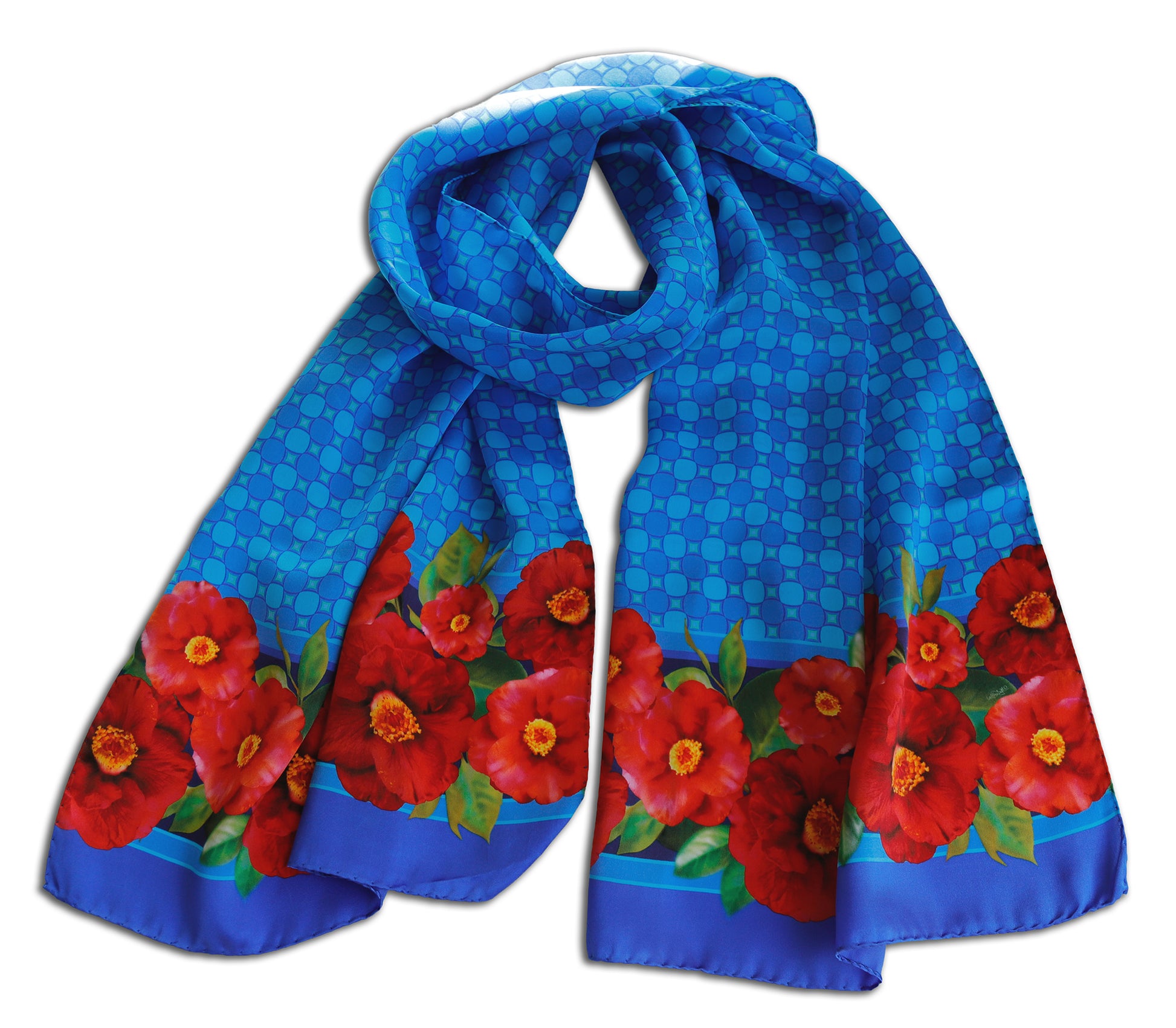 Colorate camelie rosse bordano la sciarpa, su fondo con disegno geometrico abbinato al bordo della sciarpa, in tre varianti colore: rosso, verde e blu