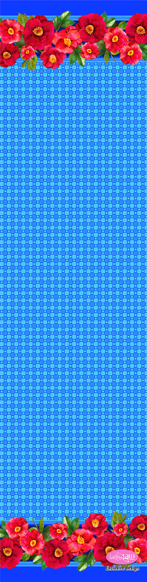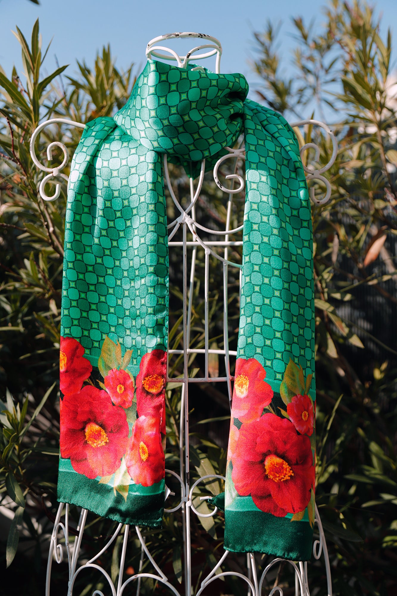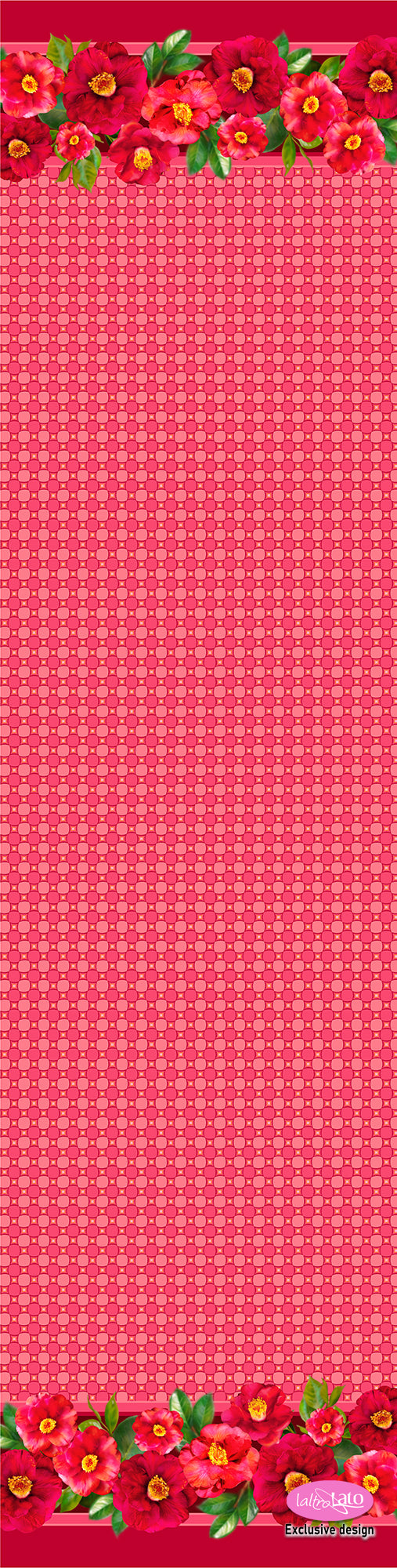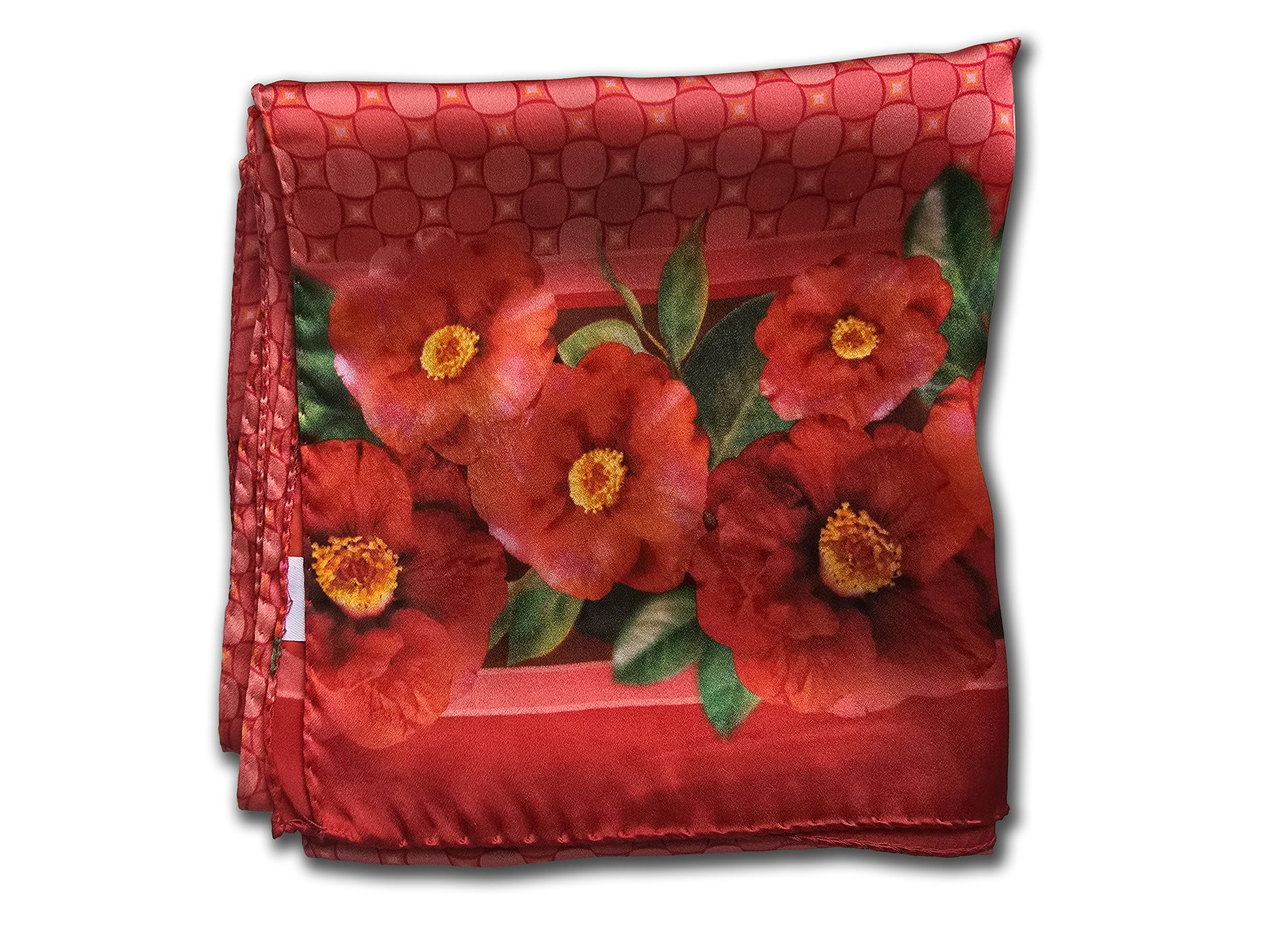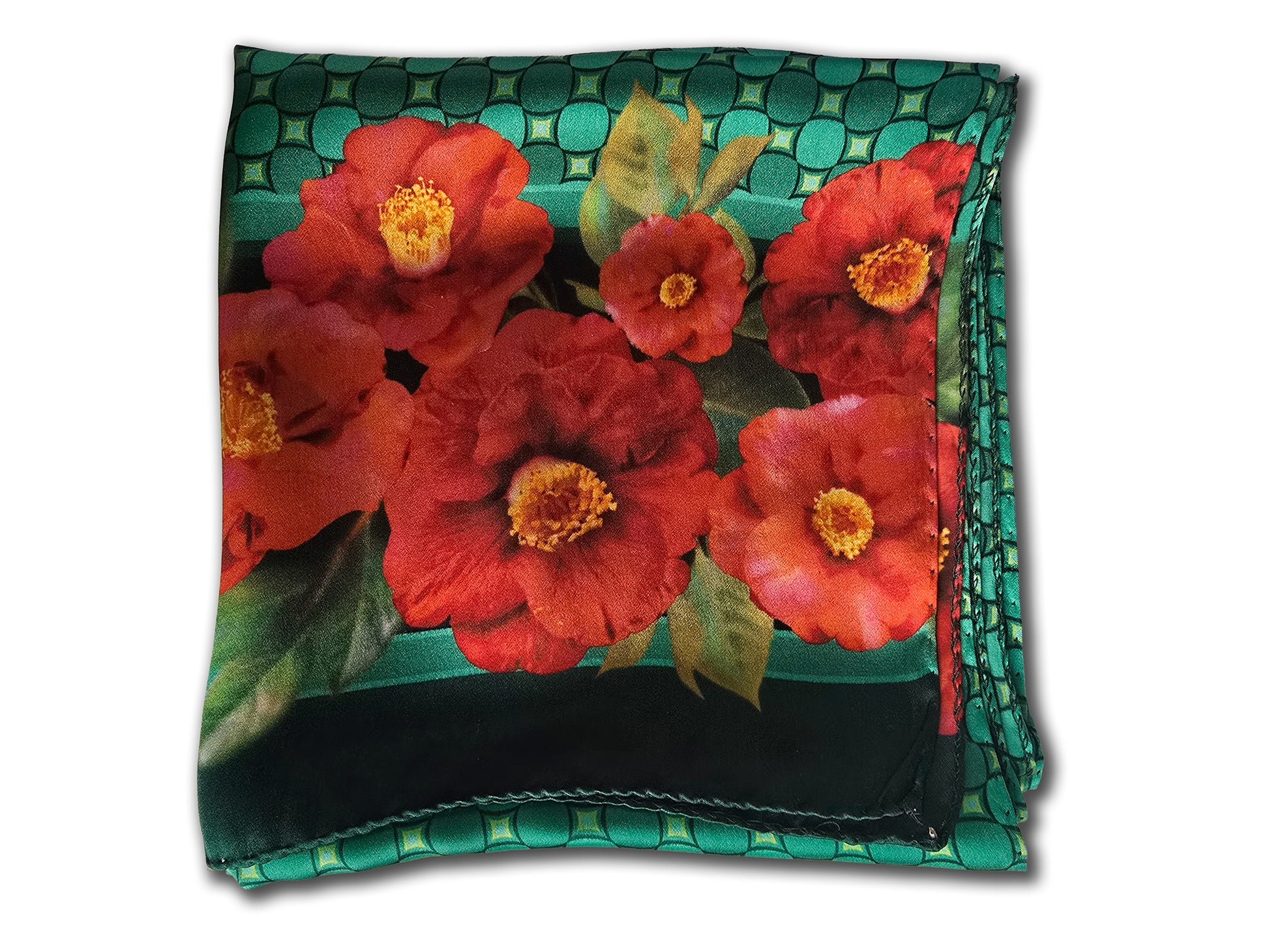 Colorate camelie rosse bordano la sciarpa, su fondo con disegno geometrico abbinato al bordo della sciarpa, in tre varianti colore: rosso, verde e blu
