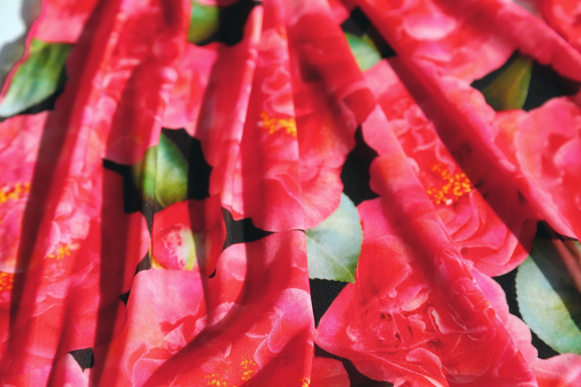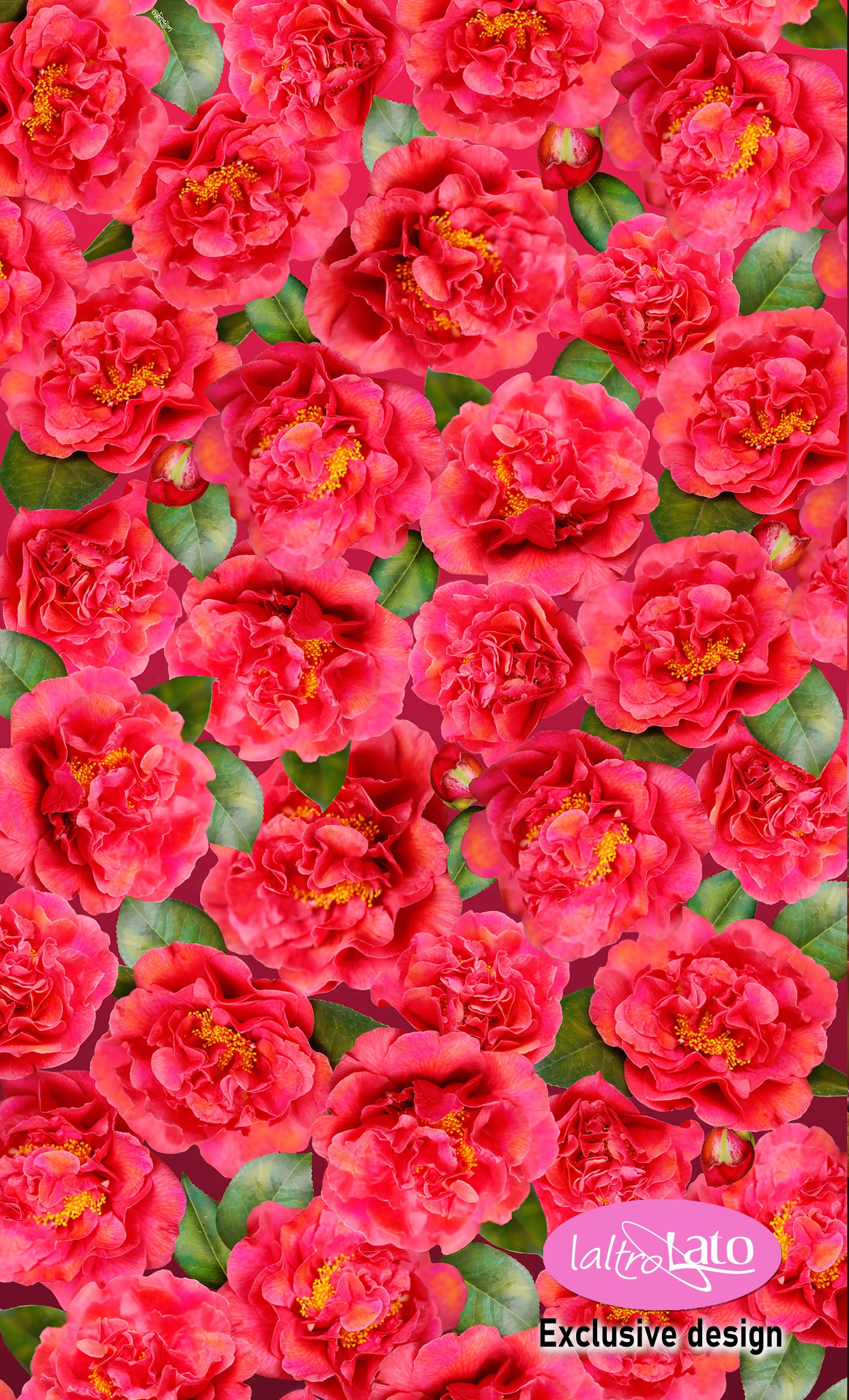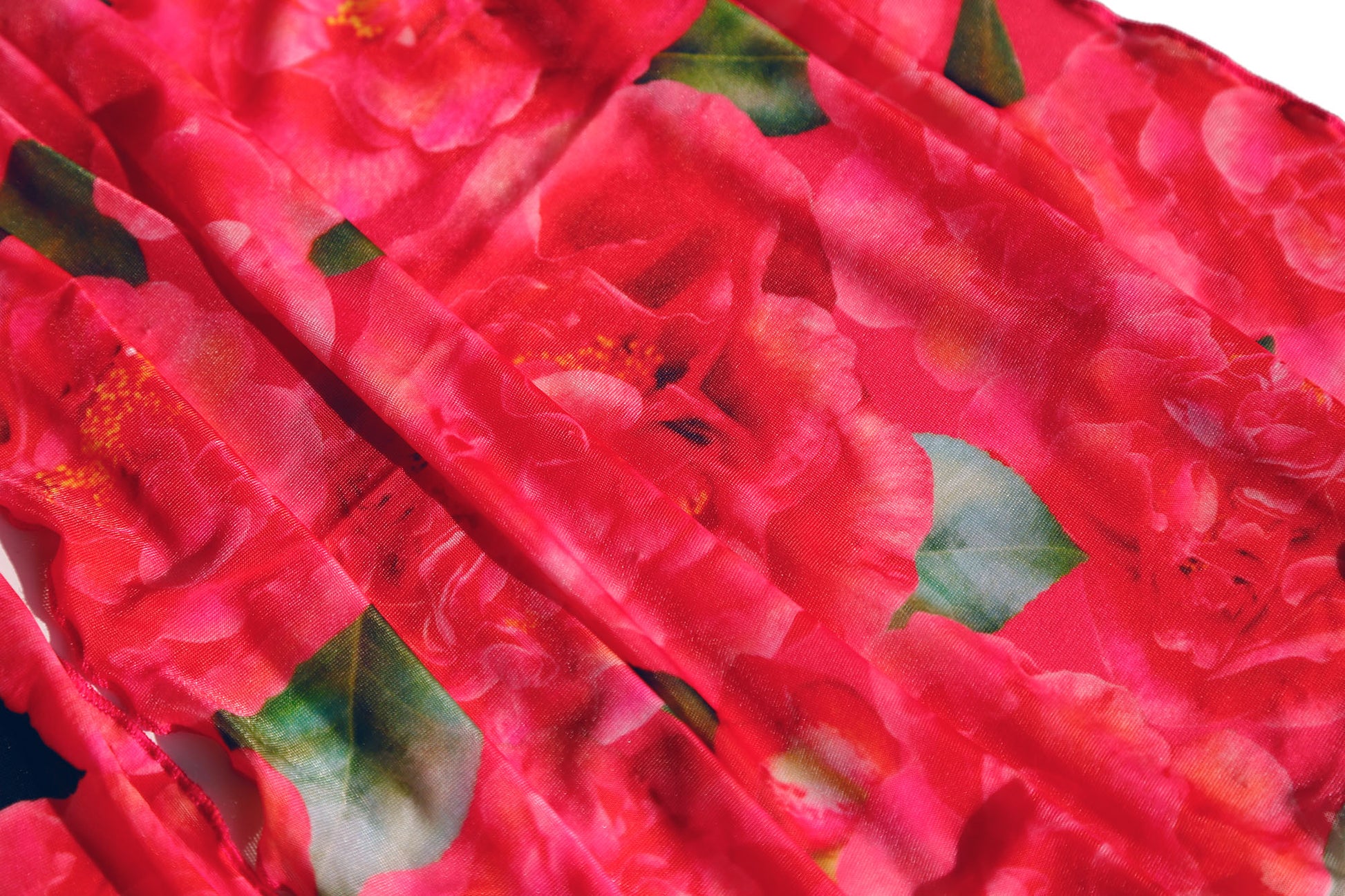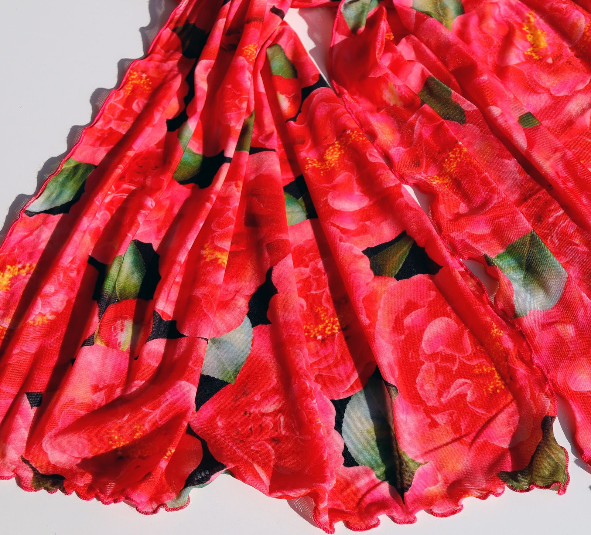 Camelie rosse con vibranti sfumature nei toni del fuxia e foglioline verdi, riempono la sciarpa ideale da utilizzare anche come top.