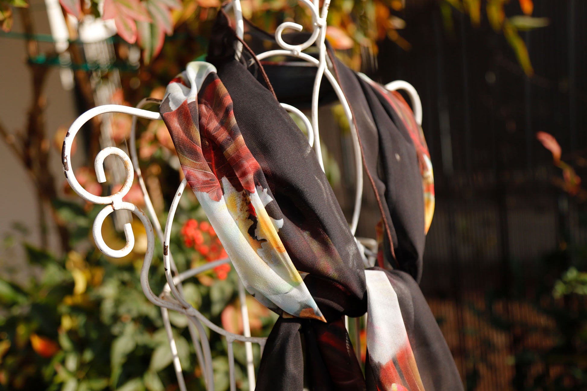Fantasia tropicale con foliage nei toni caldi dell'ocra e del marrone e fiori a contrasto che virano dal rosso al bordeaux e bianco, su fondo marrone scuro e sfumati inserti con pelle in tono con il fondo. La fantasia disegna un lato della sciarpa e i due bordi piccoli, attorno al collo si può scegliere di far prevalere il lato scuro o quello floreale.