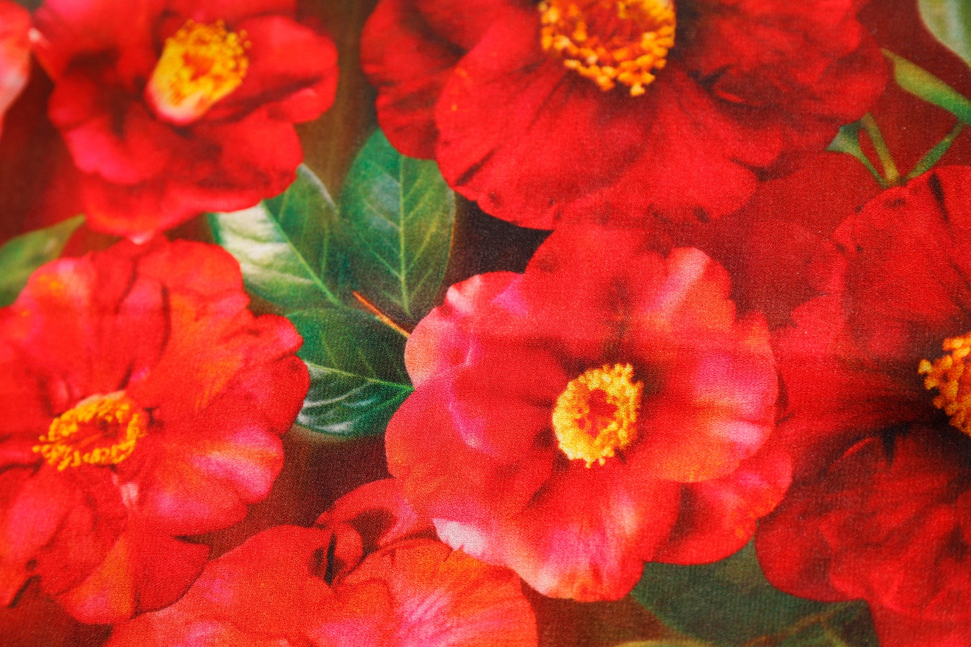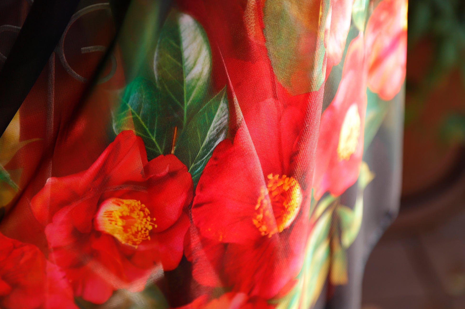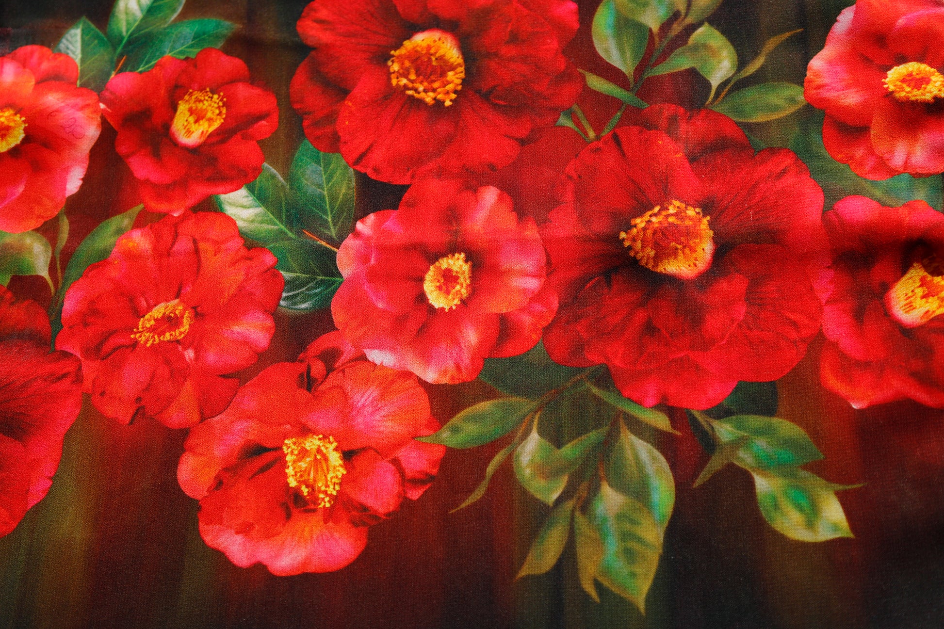 Su fondo nero, colorate camelie rosse e foglie verdi si fondono su sfumature in tono con le foglie.